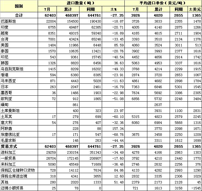 錦橋紡織網(wǎng)—資訊頻道> 統(tǒng)計(jì)資料>正文 2011年7月我國(guó)棉紗線進(jìn)口貿(mào)易方式及主要來源國(guó)別統(tǒng)計(jì)