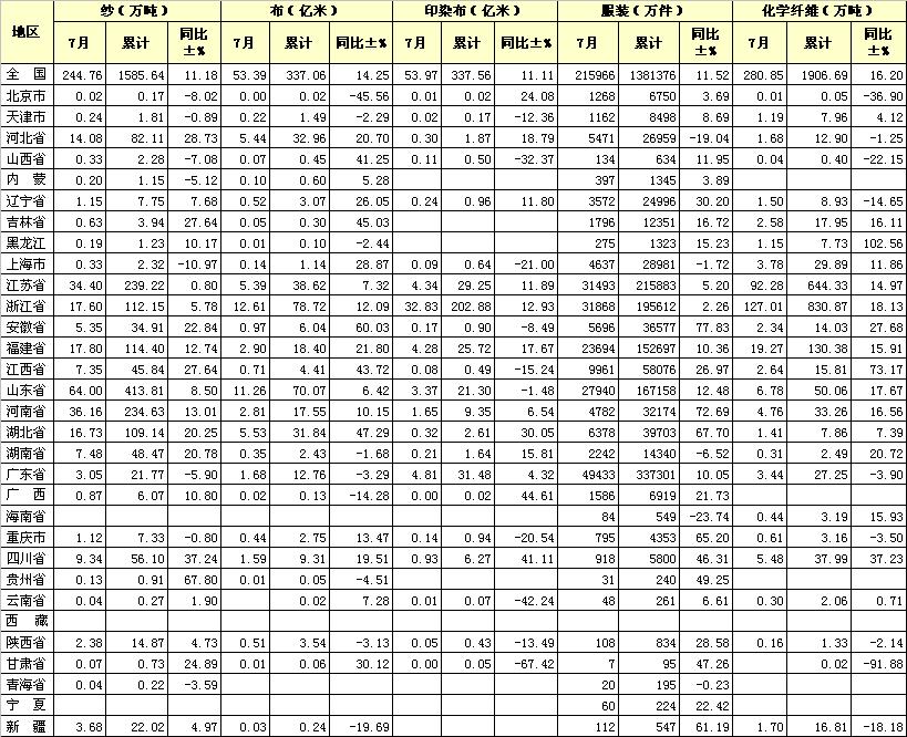 錦橋紡織網(wǎng)—資訊頻道> 統(tǒng)計(jì)資料>正文 2011年1-7月各省市主要產(chǎn)品產(chǎn)量統(tǒng)計(jì)