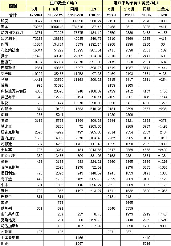 2012年6月棉花進(jìn)口主要來源地區(qū)