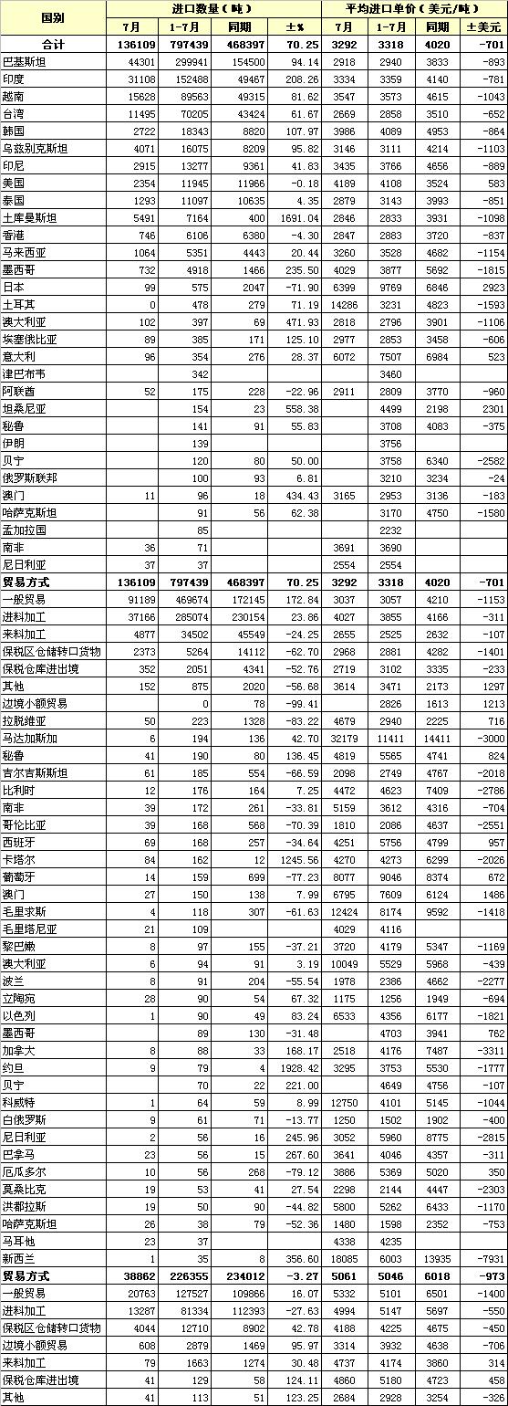 2012年7月我國棉紗線進口統(tǒng)計