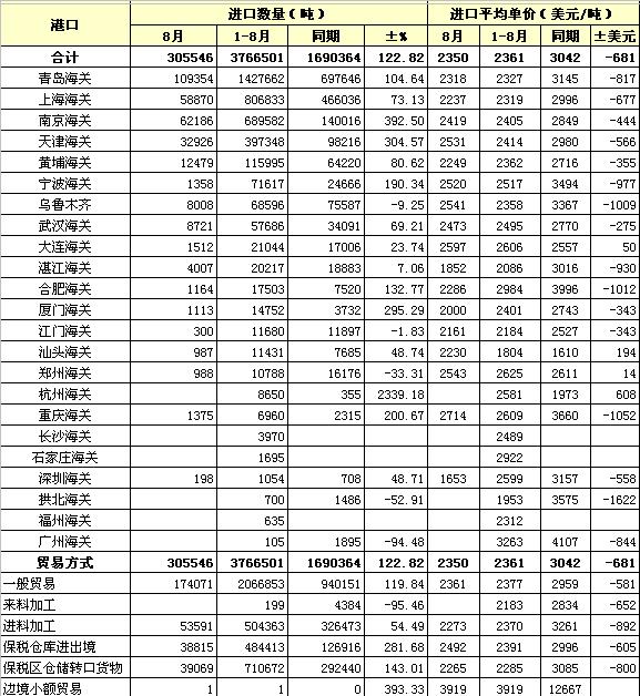 錦橋紡織網—資訊頻道> 統(tǒng)計資料>正文 2012年8月各港口棉花進口及貿易方式