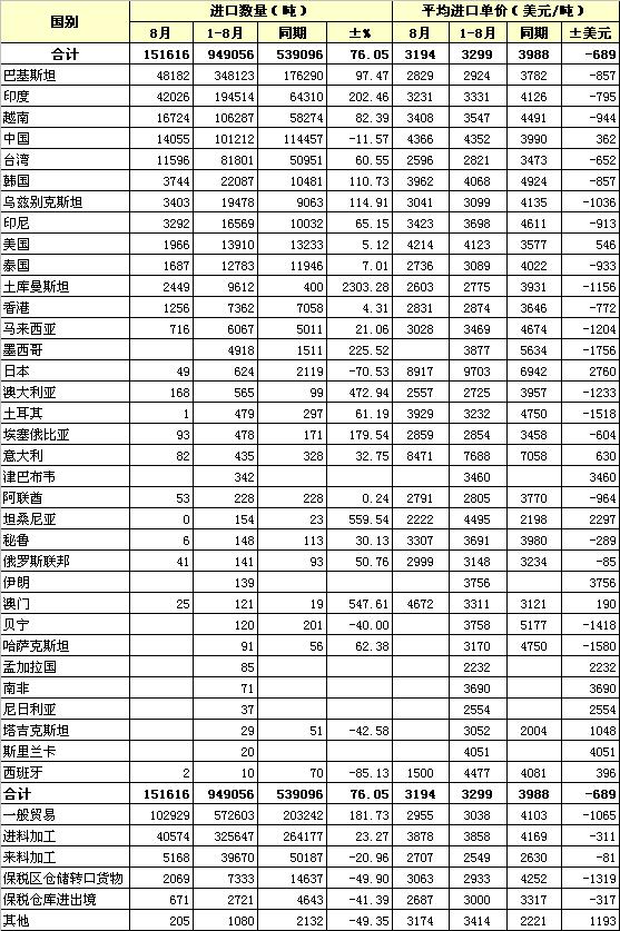 錦橋紡織網(wǎng)—資訊頻道> 統(tǒng)計(jì)資料>正文 2012年8月我國棉紗線進(jìn)口統(tǒng)計(jì)