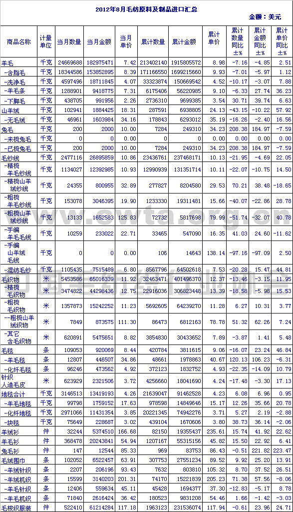 2012年8月毛紡原料及制品進(jìn)口匯總