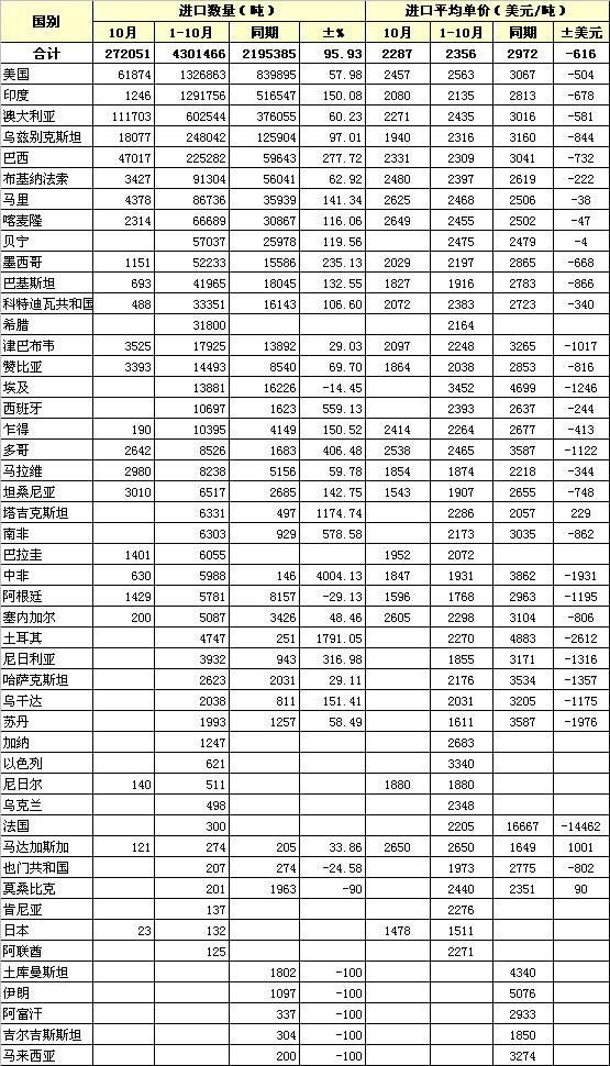 2012年10月棉花進(jìn)口主要來(lái)源地區(qū)