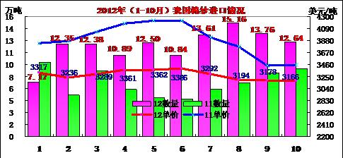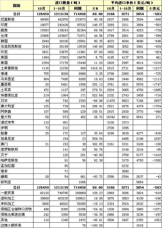 2012年10月我國棉紗線進口統(tǒng)計