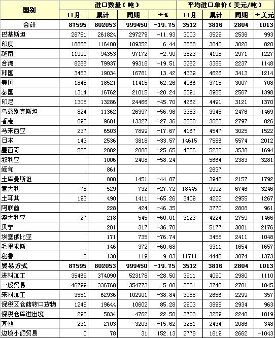 錦橋紡織網(wǎng)—資訊頻道> 統(tǒng)計資料>正文 2011年11月我國棉紗線進口貿(mào)易方式及主要來源國別統(tǒng)計