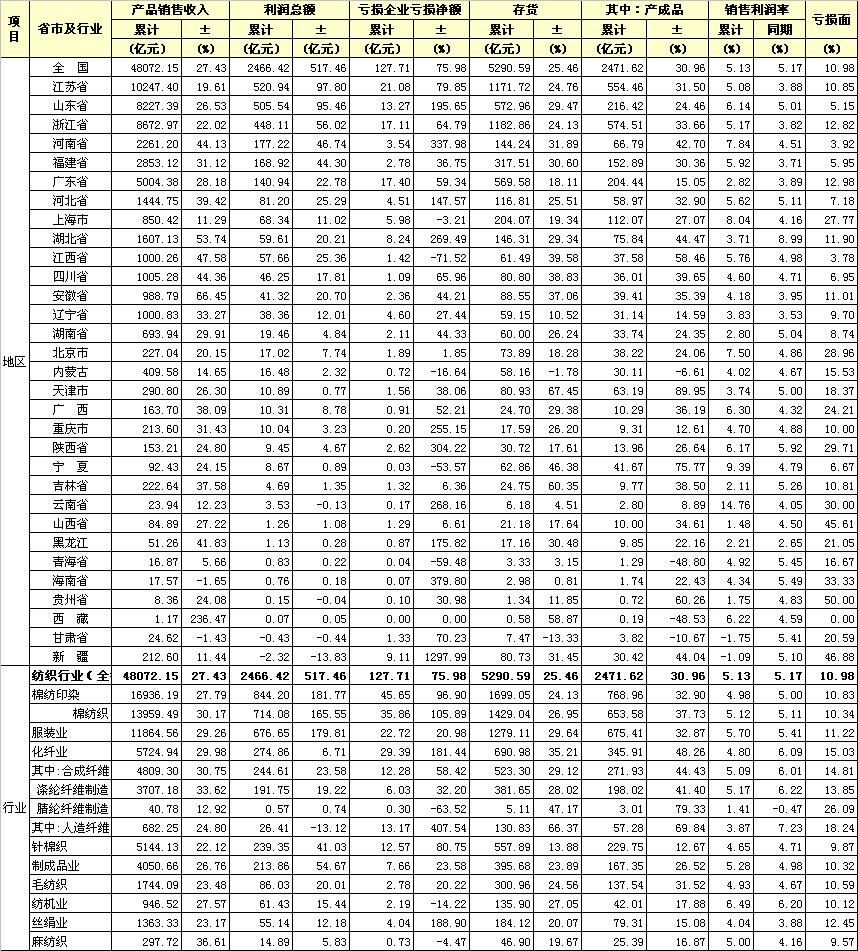 2011年1-10月紡織工業(yè)經(jīng)濟(jì)指標(biāo)完