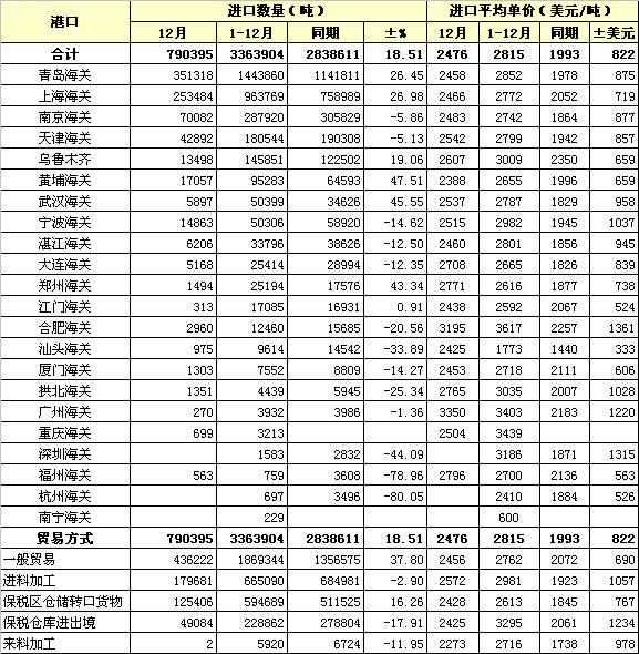 2011年12月各港口棉花進(jìn)口及貿(mào)易方式