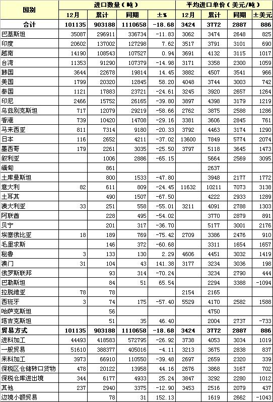 錦橋紡織網(wǎng)—資訊頻道> 統(tǒng)計(jì)資料>正文 2011年12月我國棉紗線進(jìn)口貿(mào)易方式及主要來源國別統(tǒng)計(jì)