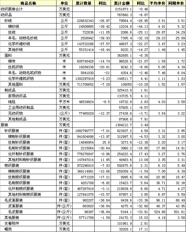 2012年1月全國紡織服裝出口產品統(tǒng)計