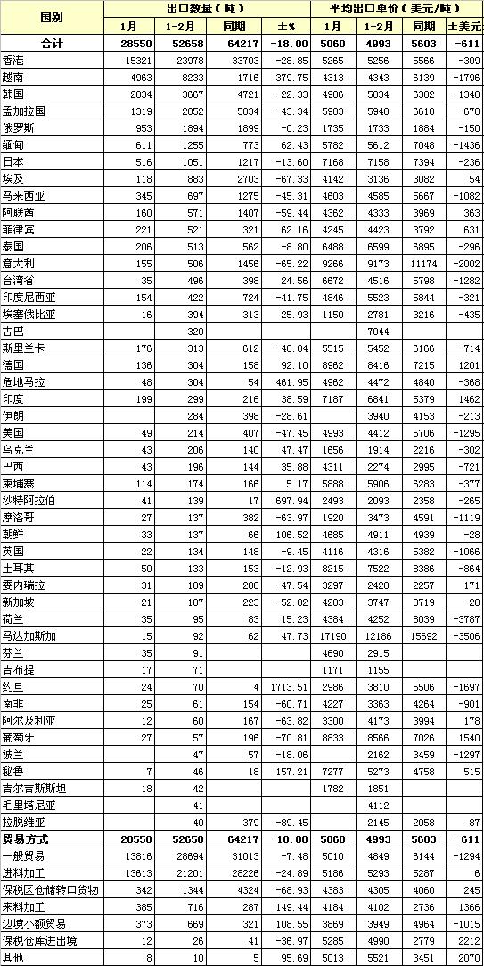 錦橋紡織網(wǎng)—資訊頻道> 統(tǒng)計(jì)資料>正文 2012年2月我國棉紗線出口統(tǒng)計(jì)