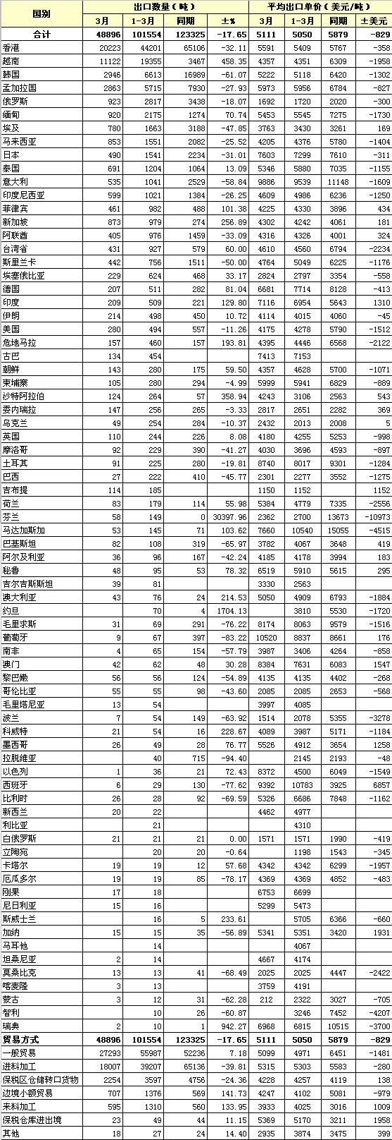 錦橋紡織網(wǎng)—資訊頻道> 統(tǒng)計(jì)資料>正文 2012年3月我國(guó)棉紗線出口貿(mào)易方式及主要國(guó)別統(tǒng)計(jì)