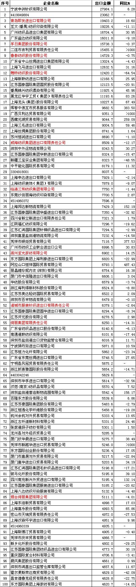 2012年1-4月中國紡織品服裝百家出口企業(yè)排名