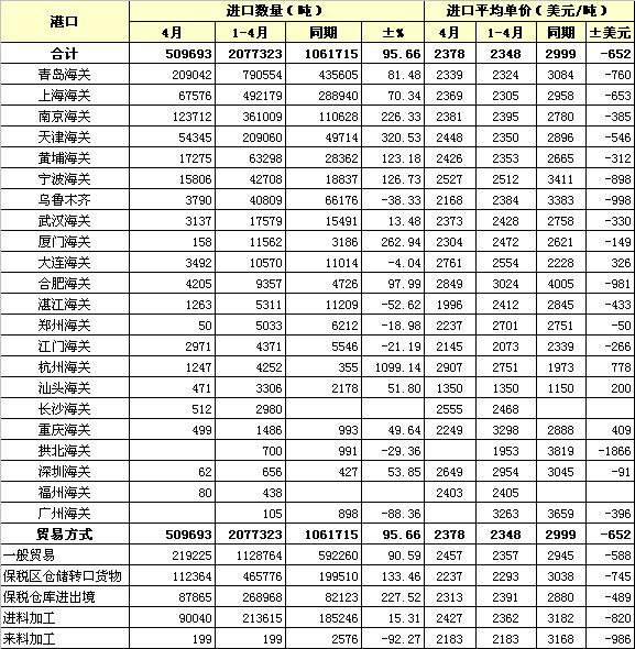 2012年4月各港口棉花進(jìn)口及貿(mào)易方式