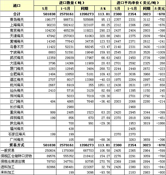 錦橋紡織網—資訊頻道> 統(tǒng)計資料>正文 2012年5月各港口棉花進口及貿易方式