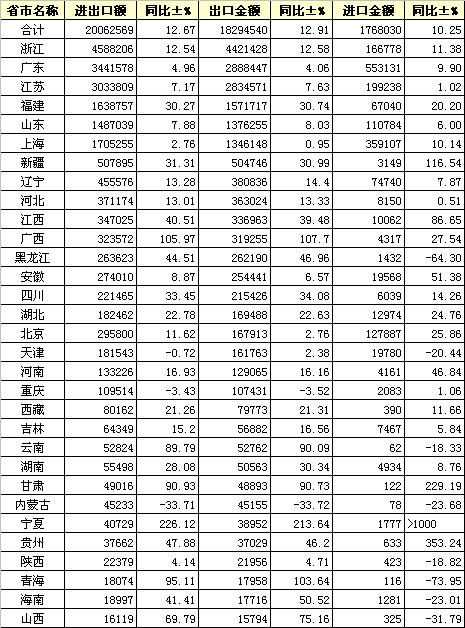 2013年8月全國紡織服裝進(jìn)出口分省市統(tǒng)計