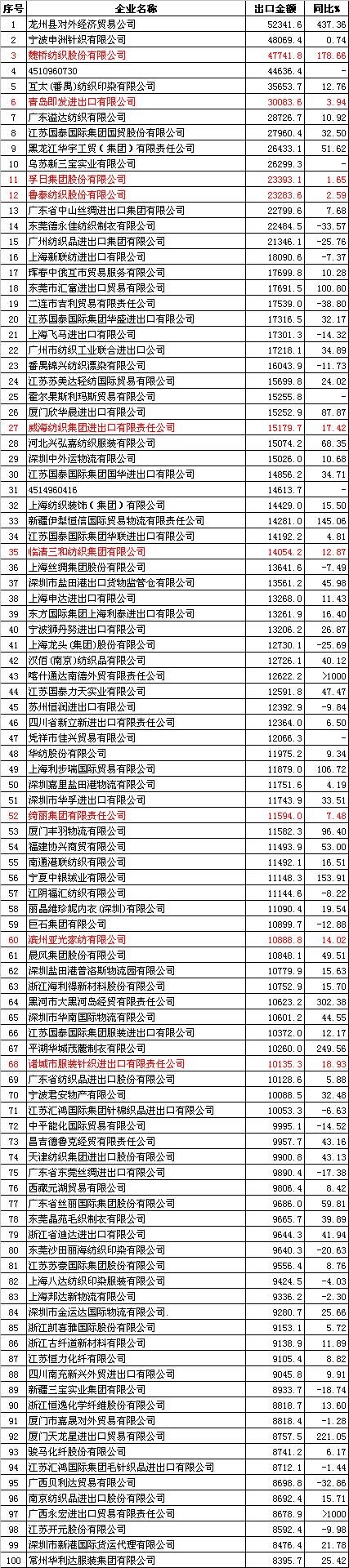 2013年1-6月中國(guó)紡織品服裝出口企業(yè)排名