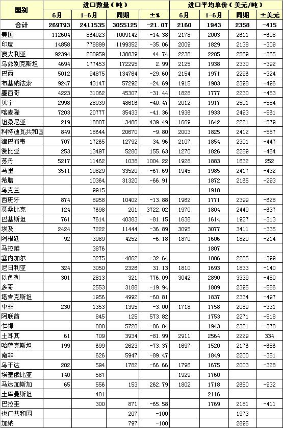 錦橋紡織網(wǎng)—資訊頻道> 統(tǒng)計(jì)資料>正文 2013年6月棉花進(jìn)口國(guó)別統(tǒng)計(jì)