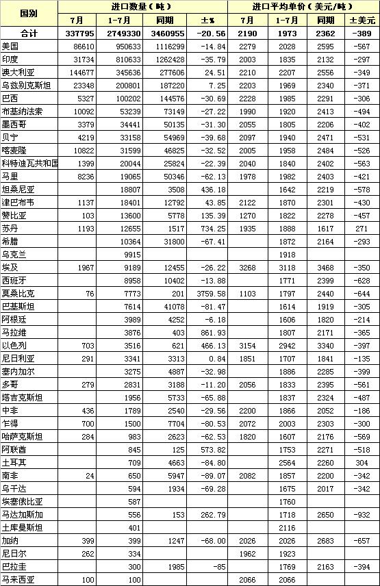 錦橋紡織網(wǎng)—資訊頻道> 統(tǒng)計資料>正文 2013年7月棉花進(jìn)口國別統(tǒng)計