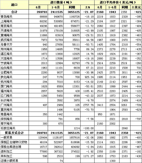 錦橋紡織網(wǎng)—資訊頻道> 統(tǒng)計資料>正文 2013年6月各港口棉花進(jìn)口統(tǒng)計