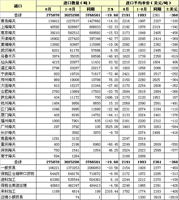 錦橋紡織網(wǎng)—資訊頻道> 統(tǒng)計(jì)資料>正文 2013年8月各港口棉花進(jìn)口統(tǒng)計(jì)