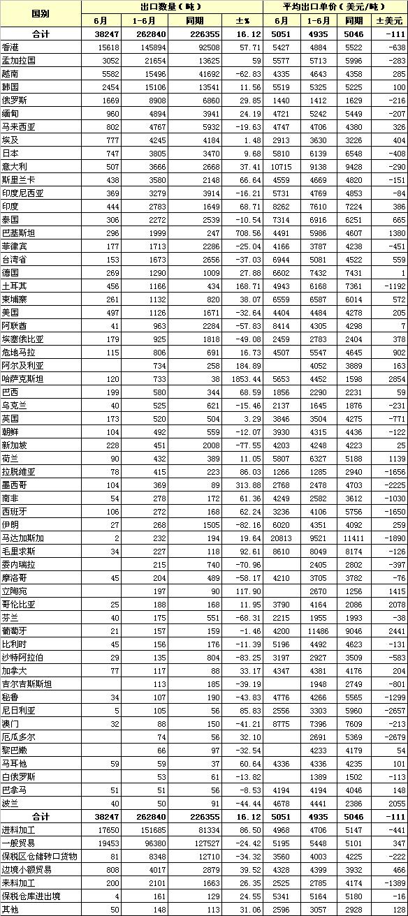 錦橋紡織網(wǎng)—資訊頻道> 統(tǒng)計資料>正文 2013年6月我國棉紗線出口統(tǒng)計