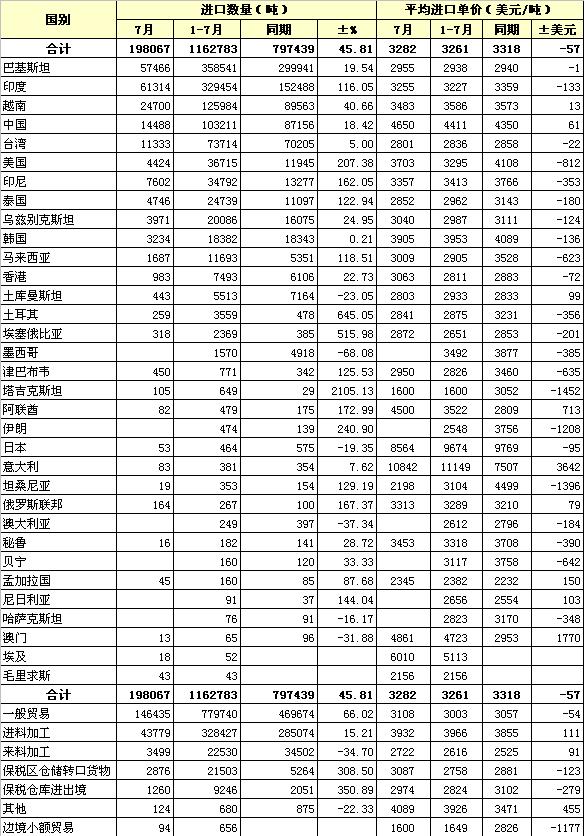 錦橋紡織網(wǎng)—資訊頻道> 統(tǒng)計資料>正文 2013年7月我國棉紗線進口統(tǒng)計