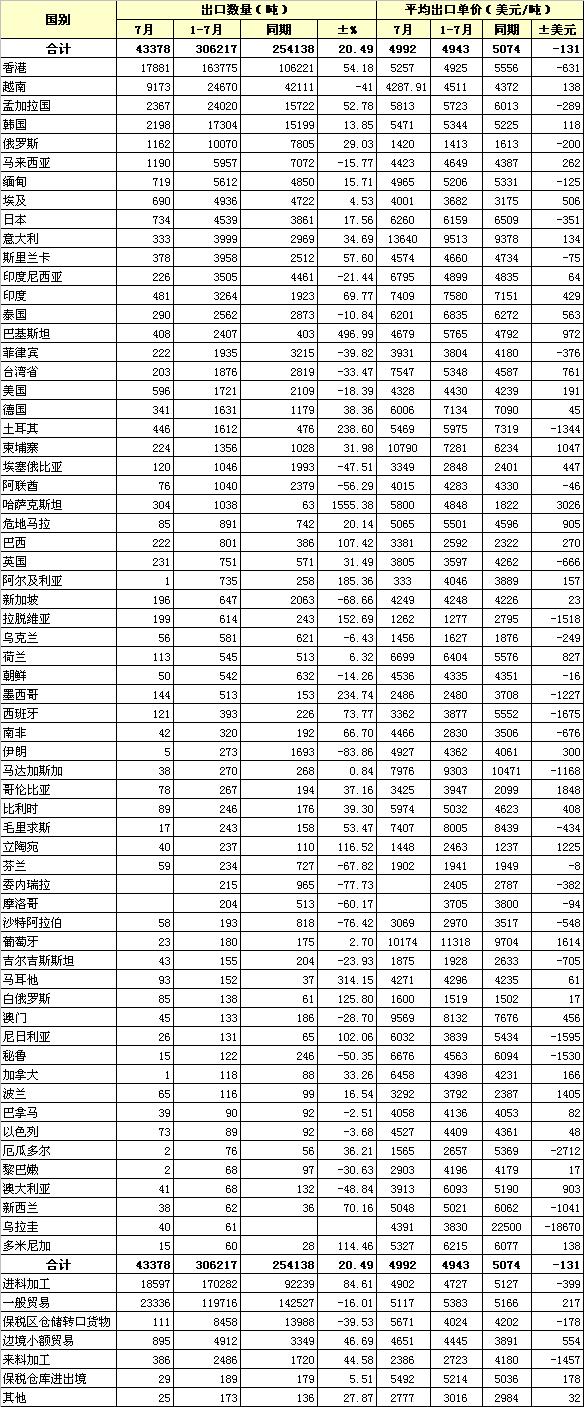 2013年7月我國(guó)棉紗線出口統(tǒng)計(jì)