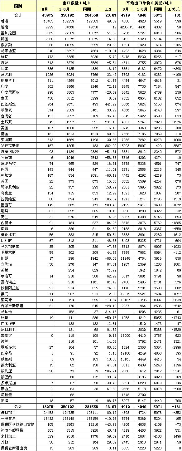 錦橋紡織網—資訊頻道> 統(tǒng)計資料>正文 2013年8月我國棉紗線出口統(tǒng)計