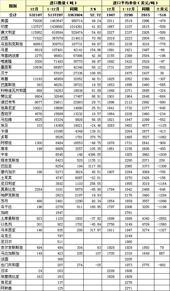 錦橋紡織網(wǎng)—資訊頻道> 統(tǒng)計(jì)資料>正文 2012年12月棉花進(jìn)口主要來(lái)源地區(qū)及國(guó)別統(tǒng)計(jì)