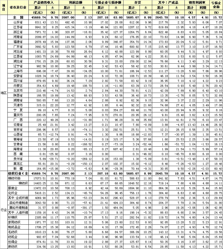 錦橋紡織網(wǎng)—資訊頻道> 統(tǒng)計資料>正文 2012年1-10月分行業(yè)、分地區(qū)主要經(jīng)濟(jì)指標(biāo)