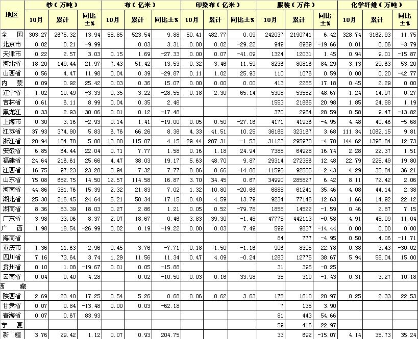 錦橋紡織網(wǎng)—資訊頻道> 統(tǒng)計(jì)資料>正文 2012年1-10月各省市主要產(chǎn)品產(chǎn)量統(tǒng)計(jì)表