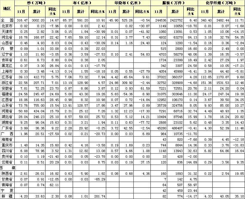 錦橋紡織網(wǎng)—資訊頻道> 統(tǒng)計資料>正文 2012年1-11月各省市主要產(chǎn)品產(chǎn)量