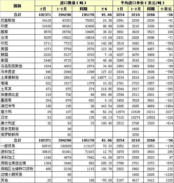 2013年2月我國(guó)棉紗線進(jìn)口統(tǒng)計(jì)