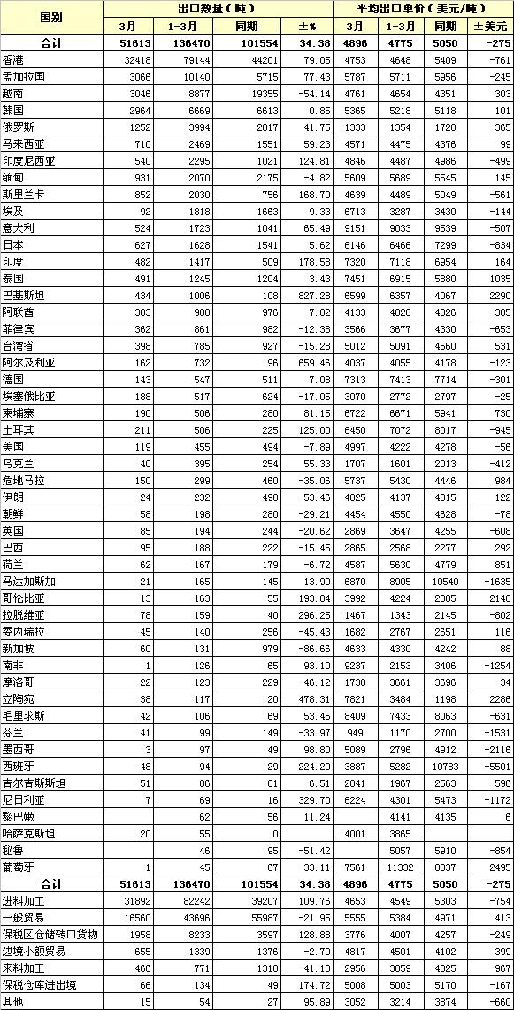 錦橋紡織網(wǎng)—資訊頻道> 統(tǒng)計資料>正文 2013年3月我國棉紗線出口貿(mào)易方式及主要國別統(tǒng)計