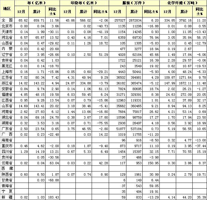 2012年12月紡織工業(yè)產量綜合統計