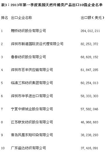 從出口企業(yè)情況來(lái)看,我國(guó)天然纖維類產(chǎn)品出口集中度較低,出口額排名前10位企業(yè)出口額合計(jì)占同期出口總額的14.5%,出口集中度較上年同期提高6.1個(gè)百分點(diǎn)。天然纖維類產(chǎn)品出口10強(qiáng)企業(yè)名單如表3: