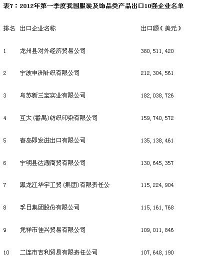 從出口企業(yè)情況來(lái)看,我國(guó)服裝及飾品類產(chǎn)品出口集中度與紡織原料類產(chǎn)品相比更為分散,出口額排名前10位企業(yè)出口額合計(jì)僅占同期出口總額的3.9%,今年第一季度出口10強(qiáng)企業(yè)名單如表7: