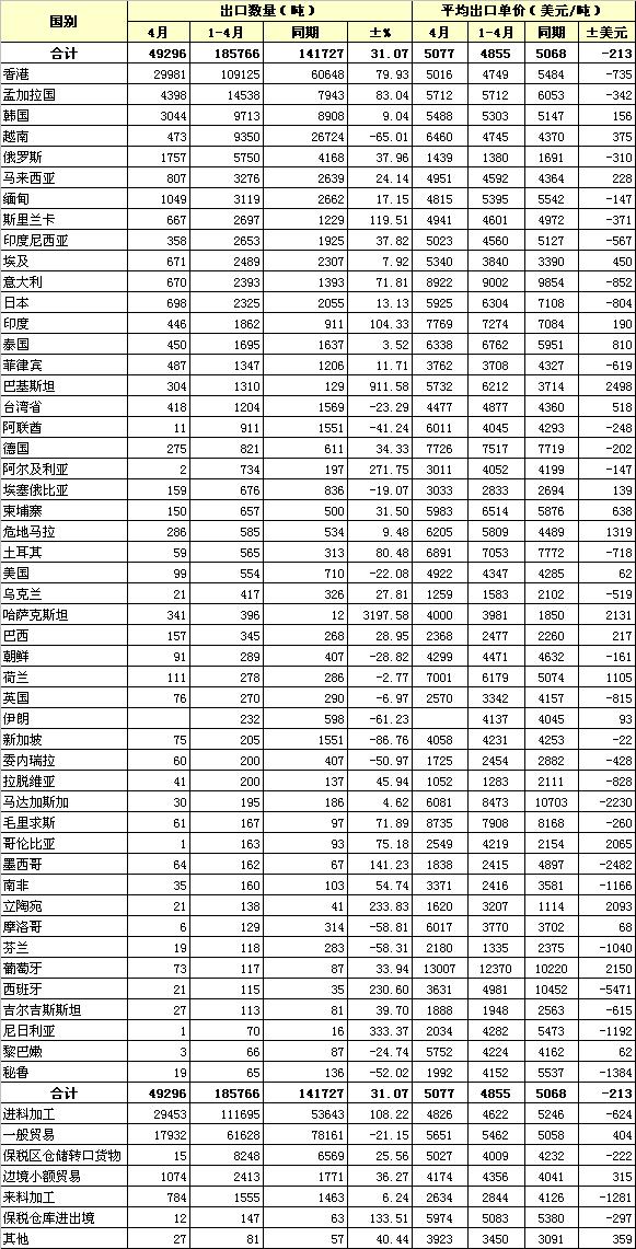 2013年4月我國(guó)棉紗線出口貿(mào)易及主要國(guó)別統(tǒng)計(jì)