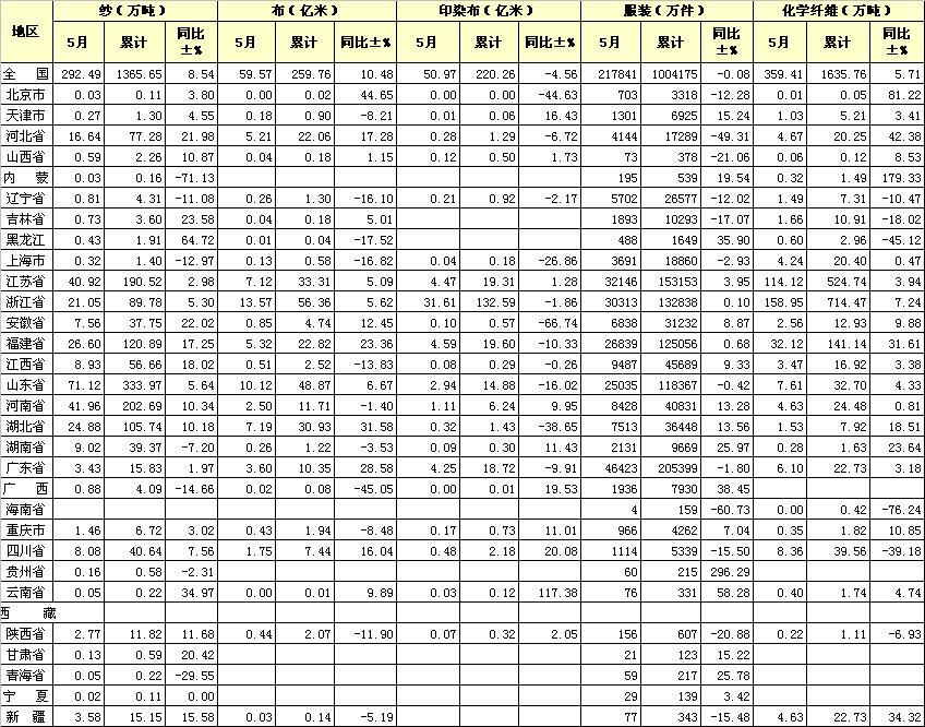 錦橋紡織網(wǎng)—資訊頻道> 統(tǒng)計資料>正文 2013年1-5月各省市主要產(chǎn)品產(chǎn)量統(tǒng)計表