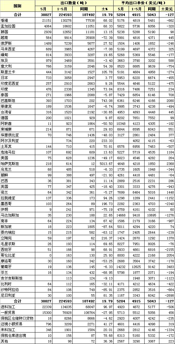 2013年5月我國棉紗線出口國別統計