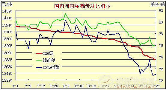 1、現(xiàn)貨棉價大幅跌落,外棉跌幅大于內(nèi)棉。國內(nèi)現(xiàn)貨棉價繼7、8兩月分別下跌近200元后,9月份棉價由13480元一跌至12846元/噸,單月跌落638余元,跌幅4.7%,目前的價位已倒退至07年上半年爆漲前的水準(zhǔn),且低于05年全年平均13100/噸的水平。幾個主產(chǎn)棉區(qū)如新疆、山東、河北、湖北等地區(qū)跌幅更大。與此同時,國際棉價跌幅也較為明顯,9月份國際棉價北歐A指數(shù)由8月末的77.8美分/磅直線下滑至70.95美分/磅,跌落6.85美分/磅(折人民幣約跌1400元/噸左右),跌幅8.8%,遠(yuǎn)大于國內(nèi)現(xiàn)貨棉價跌幅。按1%關(guān)稅率折算若低于國內(nèi)棉價300-500元/噸左右,但按暫定滑準(zhǔn)稅折算的進(jìn)口棉價仍在國內(nèi)棉價上線運(yùn)行。因此,棉花進(jìn)口進(jìn)一步減少。據(jù)海關(guān)統(tǒng)計,8月份我國進(jìn)口棉花18.69萬噸,分別比7月和去年8月減少2.61和7.17萬噸,減幅分別為12.3%和27.7%。1-8月累計進(jìn)口164.33萬噸,同比下降1.2%。其中6-8月三個月進(jìn)口棉花61.09萬噸,同比下降17.4%.即于6月份公布的從6月5日至10月5日區(qū)間執(zhí)行的暫定滑準(zhǔn)稅優(yōu)惠政策從制定到終止基本上沒有任何意義。
