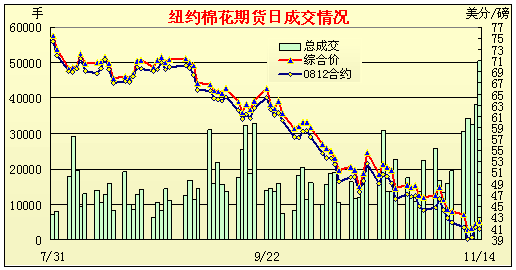 2、期貨市場底部連探,交易量有增有減 紐約棉花期貨一路下滑,全線破50美分,成交放量,減倉明顯。14日紐約期棉主體價收于42.21美分,較10月末跌430點,跌幅9.2%。日均成交27703手,比10月份上升71.7%。持倉總量14.32萬手,比10月末減倉3.13手,為06年來倉位量最低。不過上周末的三個交易日行情有所趐尾,底部盤升。