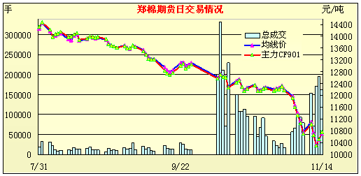 鄭棉期貨滑后趐尾,成交放量,增倉明顯,不排除有抄底現(xiàn)象。11月14日,鄭棉期貨主體價10703元/噸,較10月末下跌1519元/噸,跌幅12.4%。日均成交11.46萬手,比10月份上升9.9%。倉位總量79230手,比10月末增倉2.42萬手。