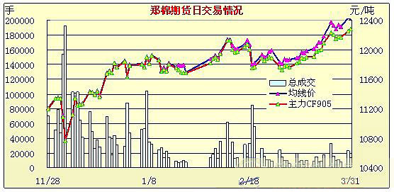 2.電子撮合和鄭棉期貨在現(xiàn)貨帶動下3月份來持續(xù)震蕩攀升,各合約價均突破12000元/噸。其中電子撮合MA系列主體價12600元/噸,鄭棉期貨主體價12400元/噸,比2月末均上漲430元左右。
