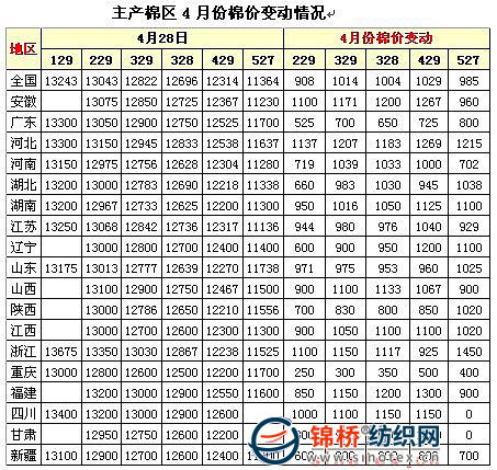 由于可流通資源大幅減少,棉企積極采購和棉商惜售加速棉價(jià)上漲。4月份棉價(jià)平均漲上千元,平均漲幅達(dá)8.5%以上,是自2008年12月份以來漲幅最大的1個(gè)月。4月份各地區(qū)棉價(jià)變動(dòng)和328級(jí)標(biāo)準(zhǔn)棉走勢(shì)圖如下: