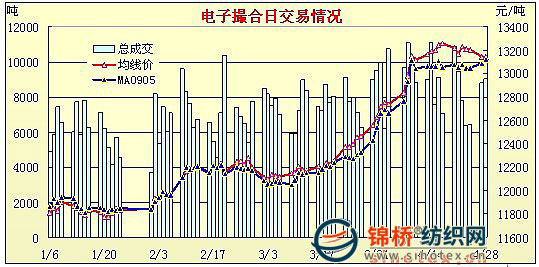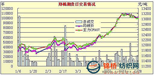 2.現(xiàn)貨拉動(dòng),國內(nèi)棉花期貨攀升后高位盤整。國內(nèi)期貨自3月份緩慢上升后,4月份加速,攀升至13000元/噸后即4月份下半月基本呈高位盤整狀態(tài)。截止4月28日鄭棉期貨主體價(jià)13058元/噸,較3月末漲650元左右,比3月初漲1220元左右。與此同時(shí),電子撮合13141元/噸,比3月末漲500元以上,比3月初漲1000元左右。鄭棉期貨和電子撮合走勢(shì)圖如下: