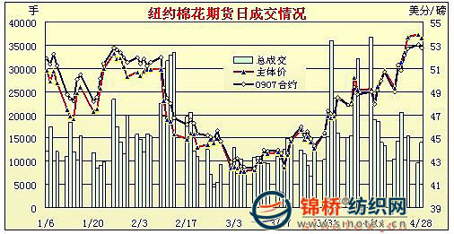 4.紐約棉花期貨大幅反彈,補(bǔ)足2月份下跌缺口。受外圍市場逐漸走強(qiáng),美棉出口增加和中國國內(nèi)棉價(jià)大幅拉升影響,4月份紐約棉花期貨大幅反彈,截止4月28日紐約棉花期貨各合約主體價(jià)53.63美分/磅,較3月末大漲670余點(diǎn),漲幅達(dá)14.3%,彌補(bǔ)此前2月份大跌780點(diǎn)跌幅缺口。