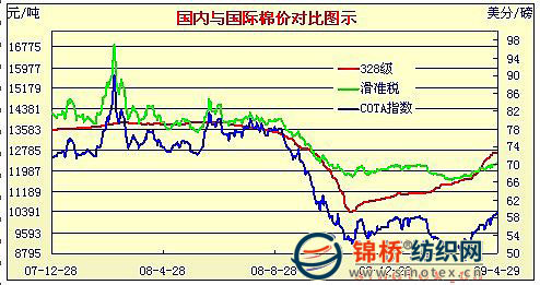 5.內(nèi)棉持續(xù)上漲,內(nèi)外棉價(jià)價(jià)差仍較明顯。從下圖國內(nèi)國際棉價(jià)對(duì)比走勢(shì)情況看,由于國內(nèi)棉價(jià)自2008年12月份以來持續(xù)上漲,外棉4月份大幅反彈補(bǔ)缺,內(nèi)外棉價(jià)差仍達(dá)2300元左右。目前我國內(nèi)現(xiàn)貨棉價(jià)約合72.7美分/磅,比現(xiàn)行國際棉價(jià)59.25美分/磅高出22.7%,折人民幣每噸高出2300元左右。進(jìn)口棉比價(jià)優(yōu)勢(shì)明顯,但按滑準(zhǔn)稅率計(jì)算則基本與國內(nèi)棉價(jià)相差無幾。