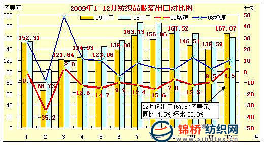 另?yè)?jù)海關(guān)最新統(tǒng)計(jì)數(shù)據(jù)顯示,12月紡織品服裝出口雙雙大幅增長(zhǎng),當(dāng)月紡織品服裝出口額167.87億美元,環(huán)比增長(zhǎng)20.26%,同比增長(zhǎng)4.49%。其中紡織品出口62.16億美元,環(huán)比、同比分別增長(zhǎng)15.8%和25.10%;服裝出口105.71億美元,環(huán)比增長(zhǎng)23%,同比下降4.75%。2009年我國(guó)紡織品服裝出口1670.24億美元,同比下降9.8%,降幅低于全國(guó)外貿(mào)出口降幅6.2個(gè)百分點(diǎn)。其中紡織品出口599.73億美元,下降8.4%,服裝出口1070.51億美元,下降11%。